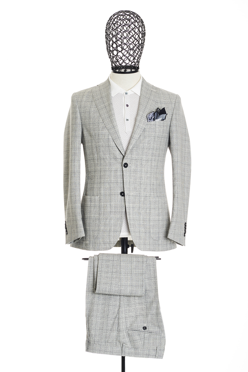 Ekose desenli, %100 Yün Takım Elbise. Mono yaka, punto dikişli, düğme kapatmalı, çift yırtmaçlı, 3 adet dış cepli, 3 adet iç cepli.Pantolon normal bel, fermuar kapatmalı, boru paça, 4 adet cepli, kemer tokalı ve astarlı.