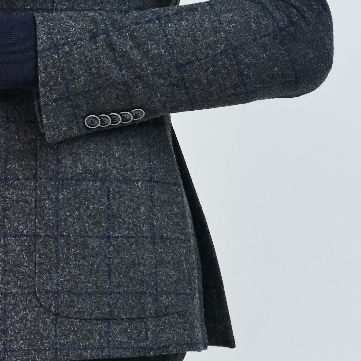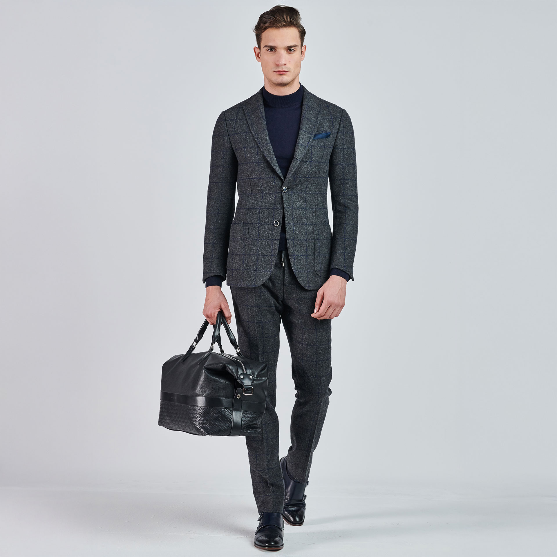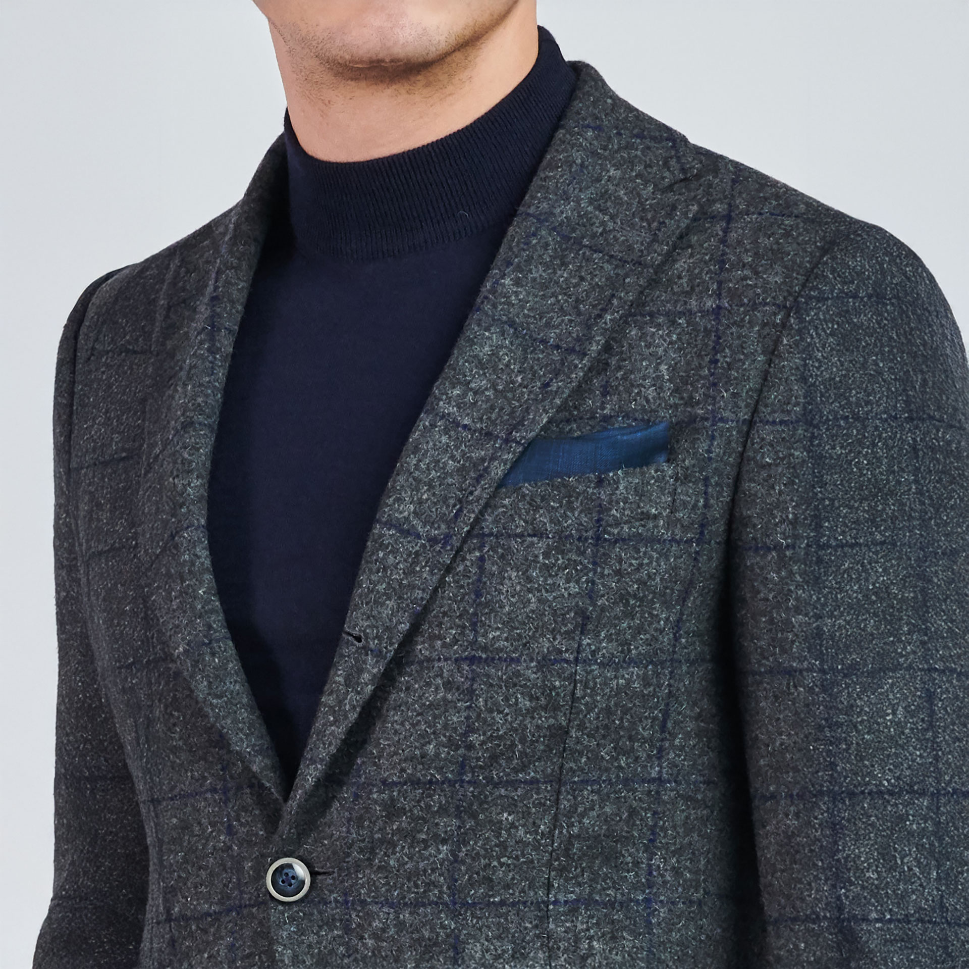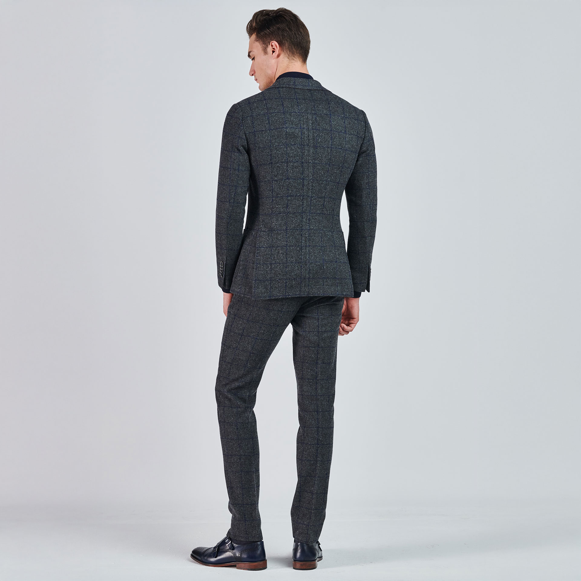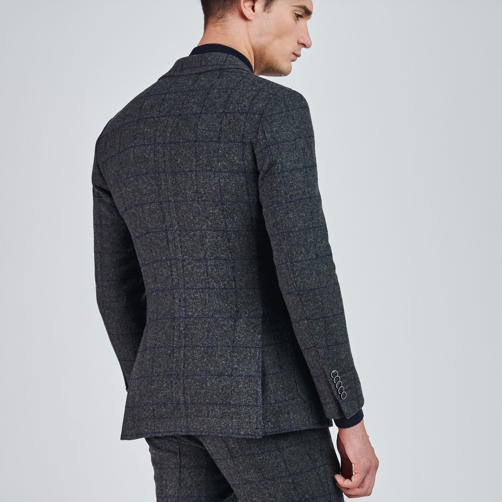 Mono yaka ve iki düğmeli ekose desen detayıyla öne çıkan takım ceketi, torba etek cep ile tamamlıyor. Pantolonu ile birleşen bu kombin, modern ve şık bir görünüm vaat ediyor.