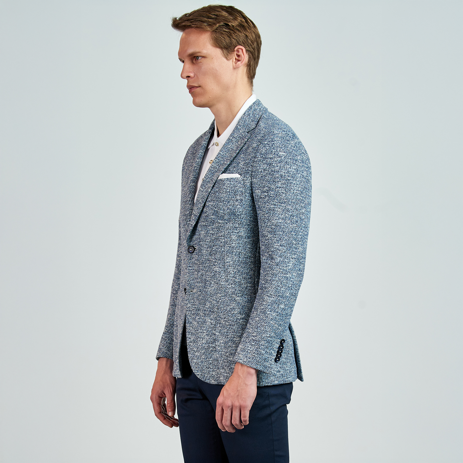 Dokulu Ceket. Mono yaka, punto dikişli, düğme kapatmalı, çift yırtmaçlı, 3 adet dış cepli, 3 adet iç cepli.