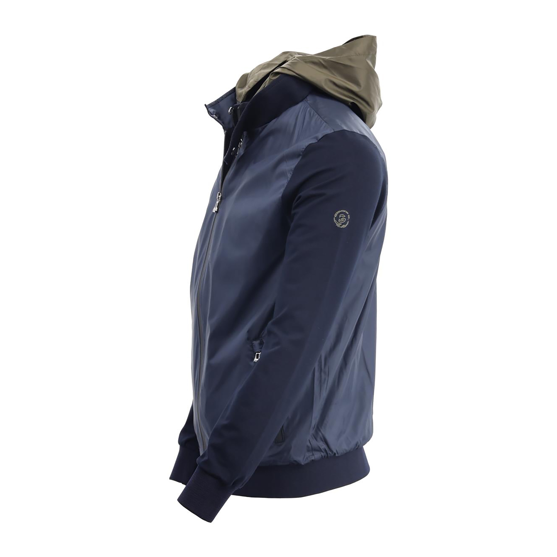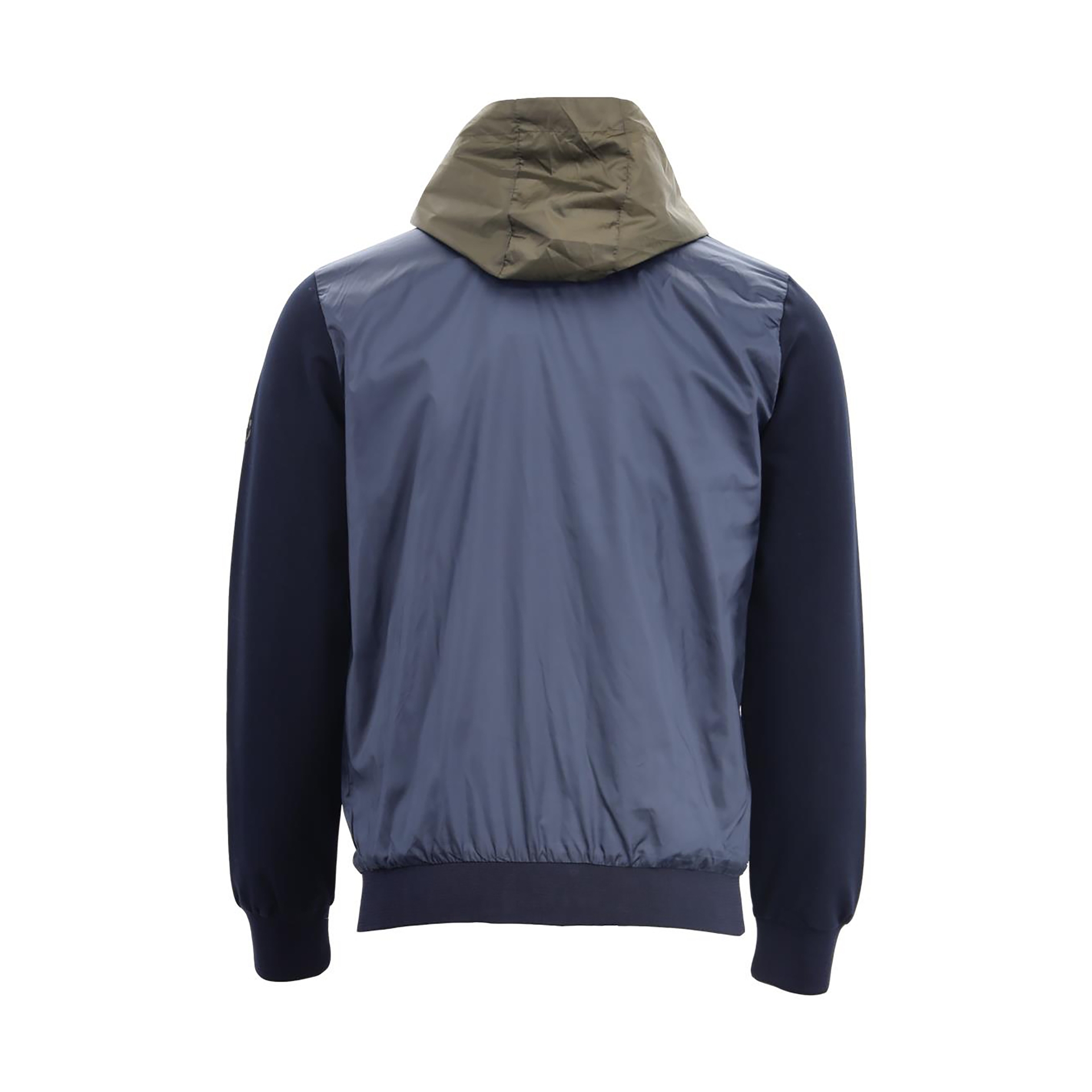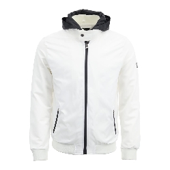 Straight collar, hood, zip fastening, print and garni detail, two outer pockets.