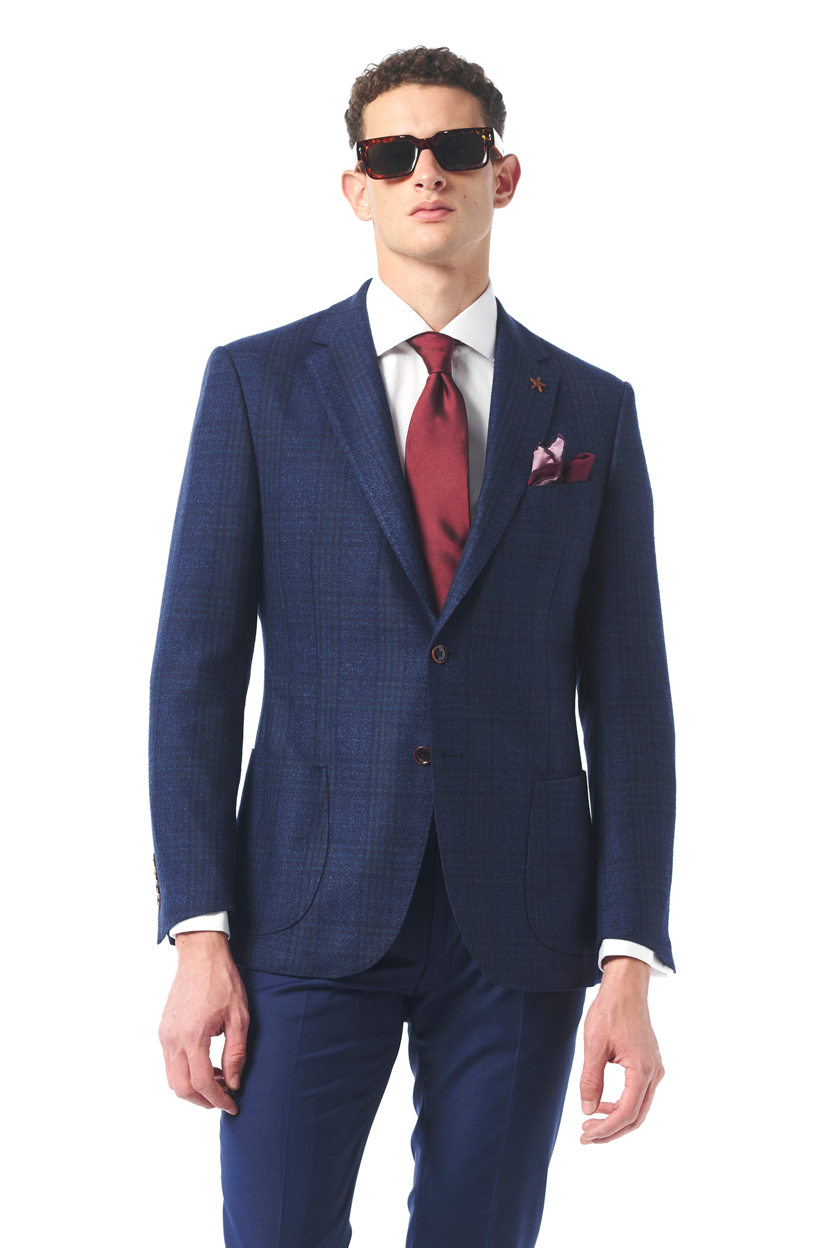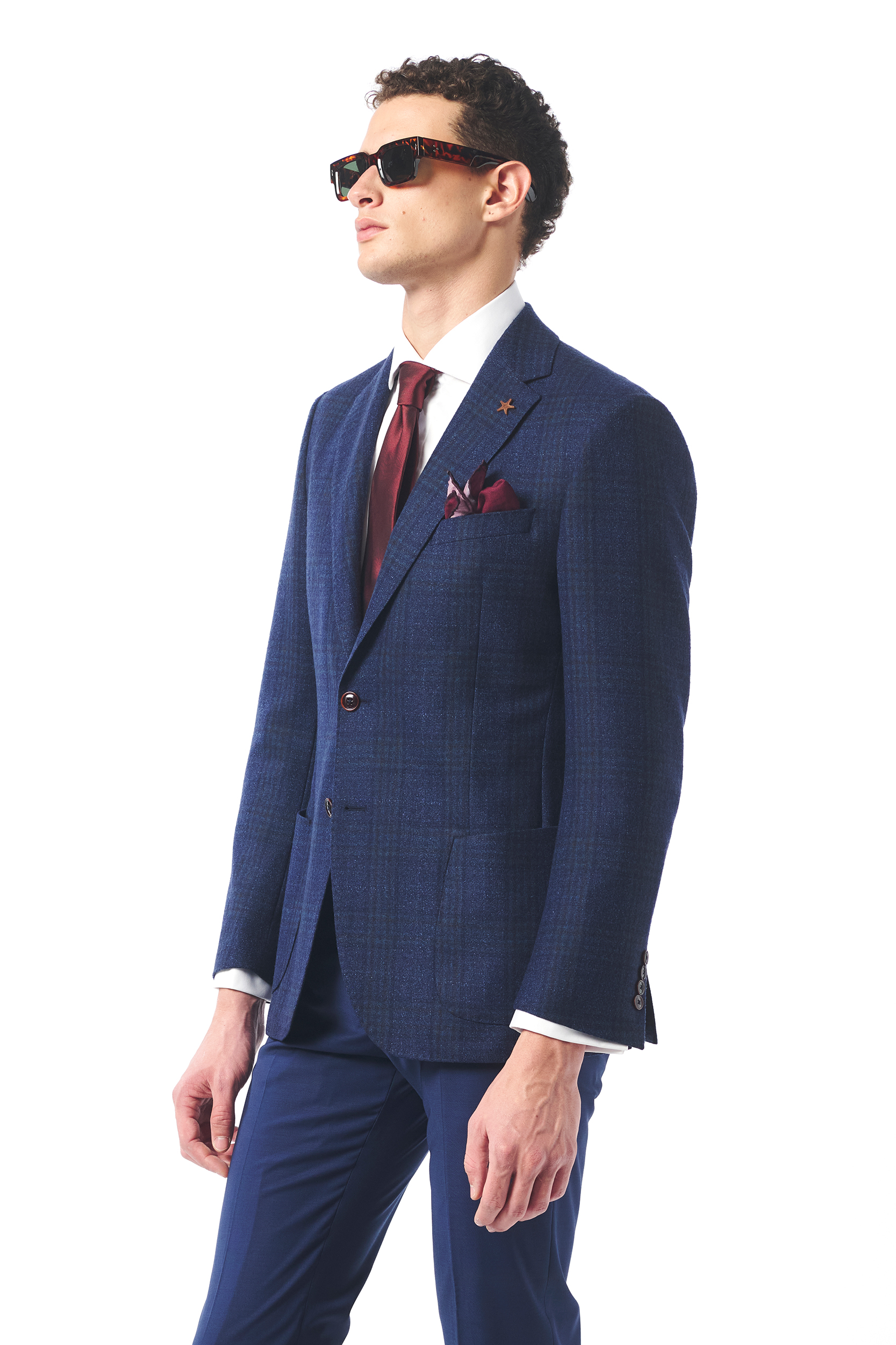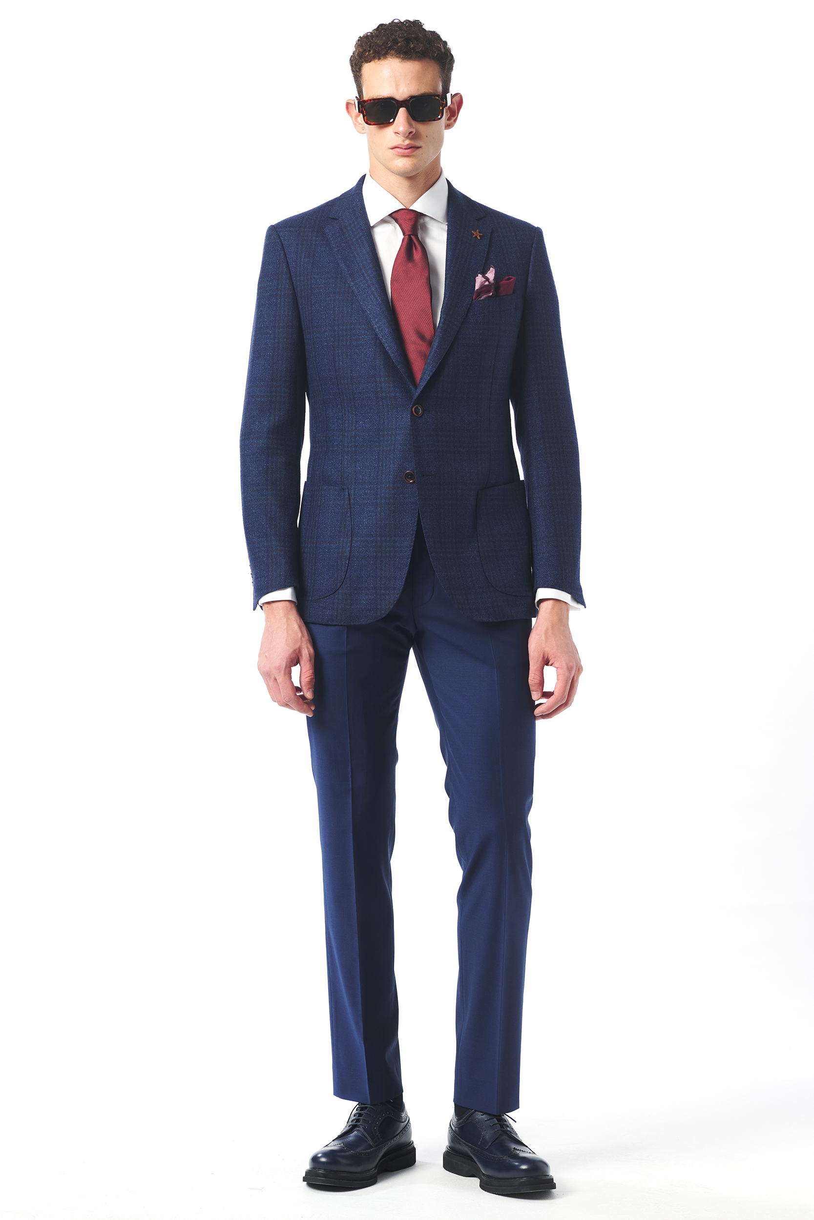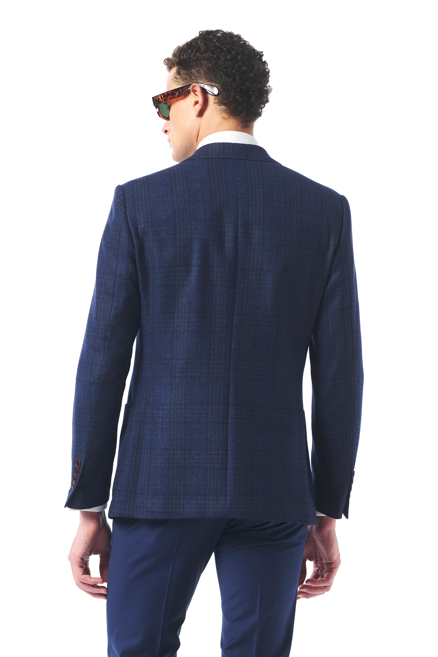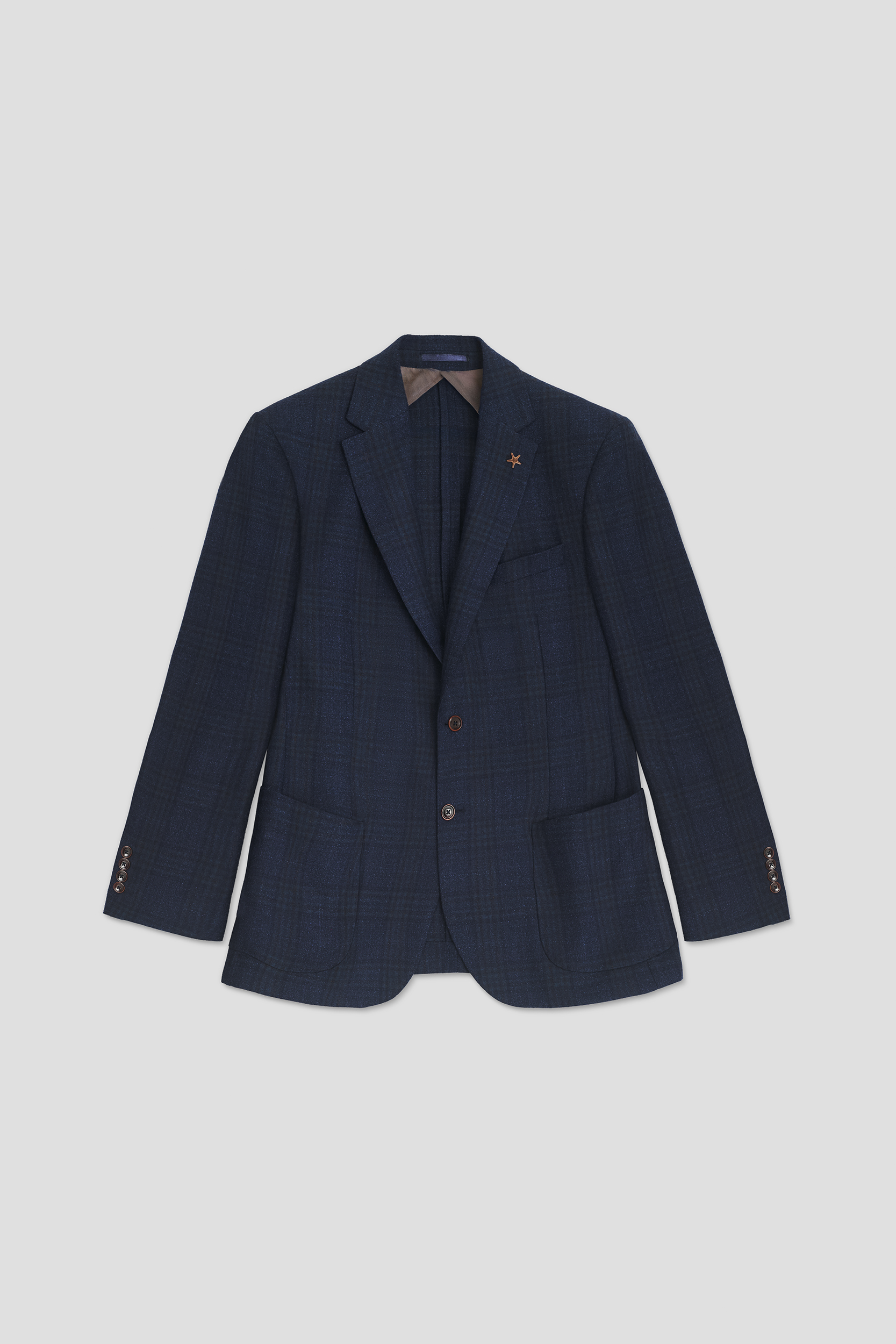 Mono Yaka Lacivert-Camel Kare Desenli Yün Blazer